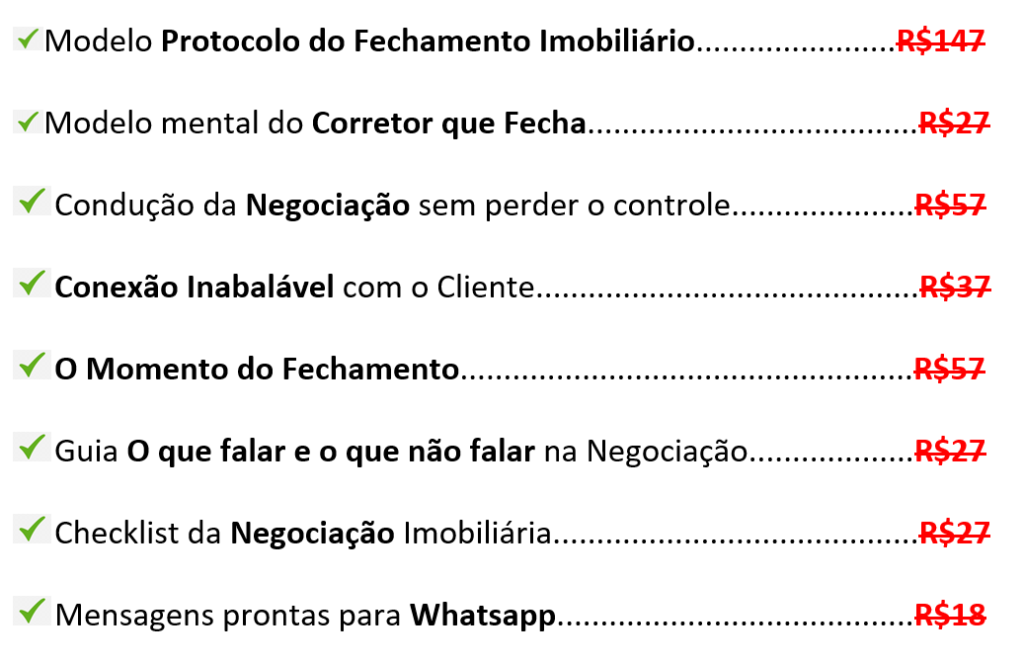 Você adquire agora o acesso completo ao PROTOCOLO DO FECHAMENTO IMOBILIÁRIO pela condição especial de R$ 67,00 e tem 7 dias para avaliar. Se por algum motivo você achar que este material não é pra você, ou que não vale o investimento, basta me enviar uma mensagem que devolvo integralmente seu dinheiro. Agora a decisão de começar é sua!